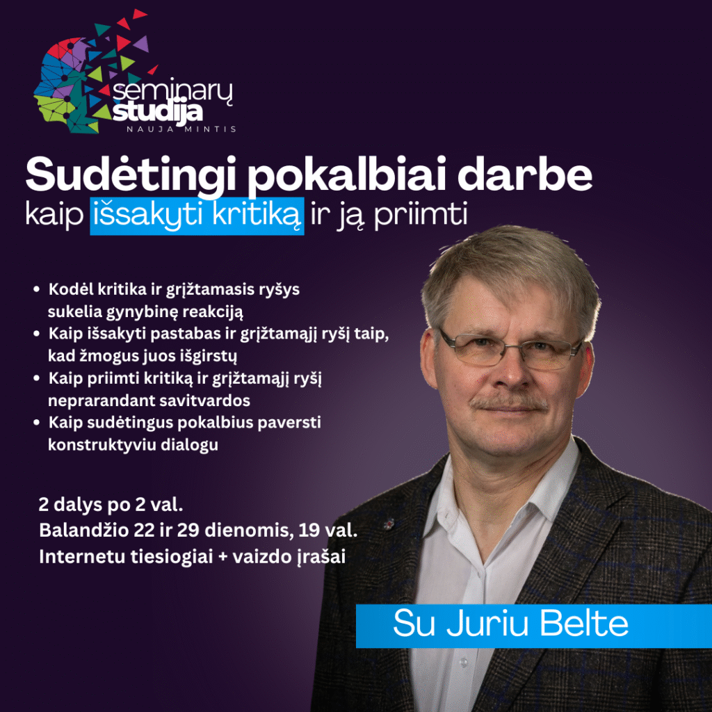 Sudėtingi pokalbiai darbe – kaip išsakyti kritiką ir ją priimti Praktinis dviejų dalių seminaras apie…